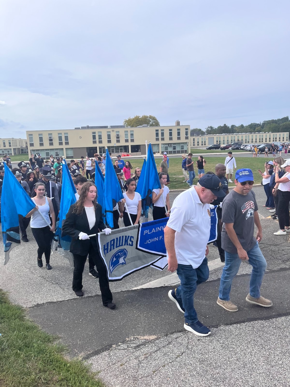 September 27th – Drums roaring, the band leader taking count, and instruments playing notes spontaneously, excitement filled the air. As POBJFK’s MaArching band began to play their signature song, “Do You Remember” by Phil Collins, the Homecoming parade started with a bang, showing off the Hawks’ spirit.Marching from Washington Park, through Mattlin, and finally arriving at our home field, the POBJFK Marching band captivated the attention of the community. Alongside the support of the district legislator, Arnold Drucker, the district administrators, including our very own Principal, Dr. Dvorak, as well as other community members, teachers, and others, walked alongside the performing students. Among the community and along the routes cleared by the police, students, parents, and children lined the sidewalks, watching closely as they fervently cheered, recorded, and immersed themselves further in the festivities, anticipating the game that was about to begin. By the time the band had arrived at the High School, the anticipation had reached a peak. As the marching band set foot onto their home field, they were met with cheers from the home audience of Plainview. Through the loudspeaker, the announcer shone the spotlight on the still-performing students, garnering even more cheers and putting the Marching Band’s riveting spirit on full display. As the band settled down, the homecoming game kicked off with intense energy. Matched against Hicksville, the Plainview Hawks took the stage with hopes high and a raised spirits.