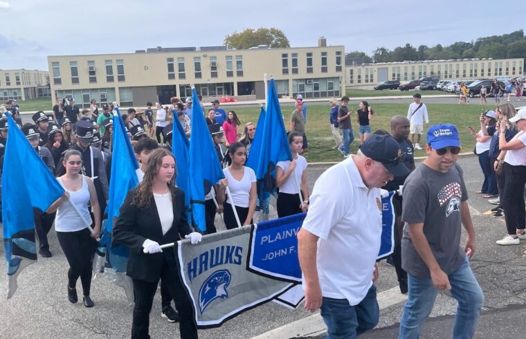 September 27th – Drums roaring, the band leader taking count, and instruments playing notes spontaneously, excitement filled the air. As POBJFK’s MaArching band began to play their signature song, “Do You Remember” by Phil Collins, the Homecoming parade started with a bang, showing off the Hawks’ spirit.Marching from Washington Park, through Mattlin, and finally arriving at our home field, the POBJFK Marching band captivated the attention of the community. Alongside the support of the district legislator, Arnold Drucker, the district administrators, including our very own Principal, Dr. Dvorak, as well as other community members, teachers, and others, walked alongside the performing students. Among the community and along the routes cleared by the police, students, parents, and children lined the sidewalks, watching closely as they fervently cheered, recorded, and immersed themselves further in the festivities, anticipating the game that was about to begin. By the time the band had arrived at the High School, the anticipation had reached a peak. As the marching band set foot onto their home field, they were met with cheers from the home audience of Plainview. Through the loudspeaker, the announcer shone the spotlight on the still-performing students, garnering even more cheers and putting the Marching Band’s riveting spirit on full display. As the band settled down, the homecoming game kicked off with intense energy. Matched against Hicksville, the Plainview Hawks took the stage with hopes high and a raised spirits.